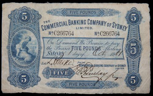 THE COMMERCIAL BANKING COMPANY OF SYDNEY LIMITED, five pounds, Sydney, Oct 1901, No C 266764(MVR2c). Very fine and very rare as issued note.
