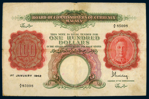 MALAYA, Board of Commissioners of Currency, one hundred dollars, 1st January 1942, A/2 85098, (P.15). Graffiti on reverse, otherwise fine, and rare.