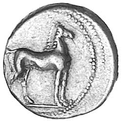 ZEUGITANIA, Carthage, (c.350-320 B.C.), gold stater, (9.348 grams), obv. head of Tanit to left, crowned with wreath of corn, wearing earring with triple pendants and necklace, dotted border, rev. free horse standing to right, single exergue line below, three dots before horse's front leg, dotted border, (cf.S.6451, Jenkins Group IIIf No.47 [same obverse die, and probably the same reverse die] = Pozzi 3306). Off centred on the reverse and less so on the obverse, double struck on the reverse, otherwise good very fine an unpublished dies.