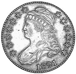 U.S.A., silver half dollar, 1821, Liberty Cap type, Overton 106. Blue and gold toning over ...