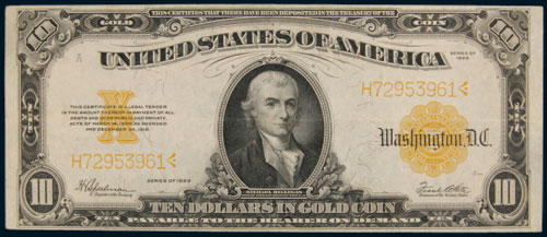 U.S.A., gold certificate, ten dollars, series of 1922, H72953961 (P. 274). Nick tear in right edge, flattened otherwise very fine or better.