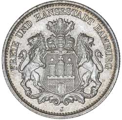 GERMANY, Hamburg (City), silver five mark 1913J, (KM.293). Lightly toned uncirculated.