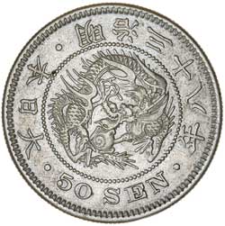 JAPAN, fifty sen, Meiji year 38 (1905) (KM.Y.25) type 1; another year 42 (1909) (KM.Y.31). ...