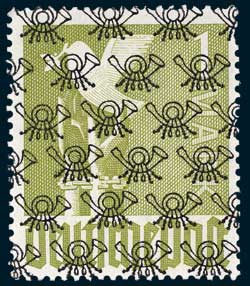 GERMANY, 1948 American Zone, local issue on 1, 2, 3 and 5 Dm 'Dove of Peace' with overprint with multiple images of horns, (5 DM illustrated), the issue of 18 June 1948, currency reform, (MiA1/11-A1V/11 CV 1000 Euros; SG (cf.p54 lower values only, 1 - 5 Dm not listed). MUH. (4)