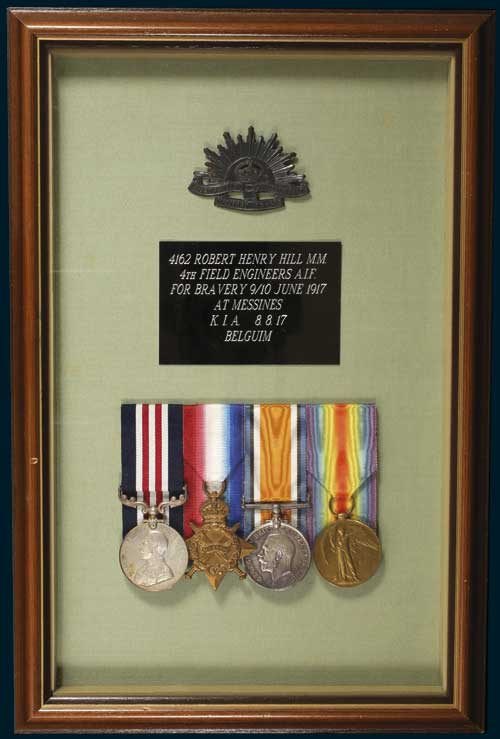 SINGLES: Military Medal (GVR type 1); 1914-15 Star; British War Medal 1914-18; Victory Medal 1914-19. 4162 Cpl. R.H.Hill 4 F/Coy Aust E. on first medal, details on second medal not visible because of mounting, 2709 Pte J.C.Kruss 27 Bn. A.I.F. on third medal, 6079 Pte S.Coffey 22 Bn. A.I.F. on last medal. All named medals impressed. Four single medals mounted in a timber frame under perspex and with an oxidised bronze Rising Sun badge above as well as a plaque with details, '4162 Robert Henry Hill M.M. 4th Field Engineers A.I.F. For Bravery 9/10 June 1917 At Messines K.I.A. 8.8.17 Belgium', fine - very fine.