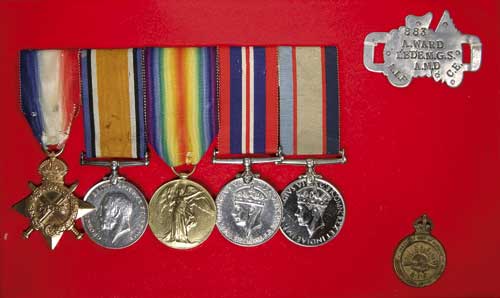 GROUP OF FIVE: 1914-15 Star; British War Medal 1914-18; Victory Medal 1914-19; War Medal 1939-45; Australia Service Medal 1939-45. 883 Pte A Ward 3 L.H.R. A.I.F. on first and third medals, 883 Pte A.Ward. 3/L.H.Rgt. A.I.F. on second medal, S2818 A.Ward on last two medals. All medals impressed. Display mounted, first three ribbons damaged, otherwise fine - very fine.