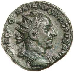 TRAJAN DECIUS (A.D. 249-251), AE dupondius, issued 250, Rome mint, (9.23 g), obv. radiate draped ...