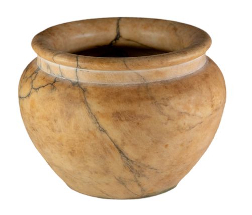 ANCIENT EGYPT, (c.3000-1500 BCE), yellow marble stone pot (9.5cm x 7.5cm), green veining throughout. Two small chips on lip, one small chip through veining on body, otherwise very fine and scarce.