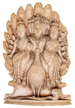 INDIA, late 19th century, tusk carving of the Hindu God of War, Kartikeya, depicted mounted on a Peacock, holding a variety of weapons, flanked by two consorts, snake at base, (12cm high, 8cm wide). A few losses to the top right, otherwise very fine and scarce.