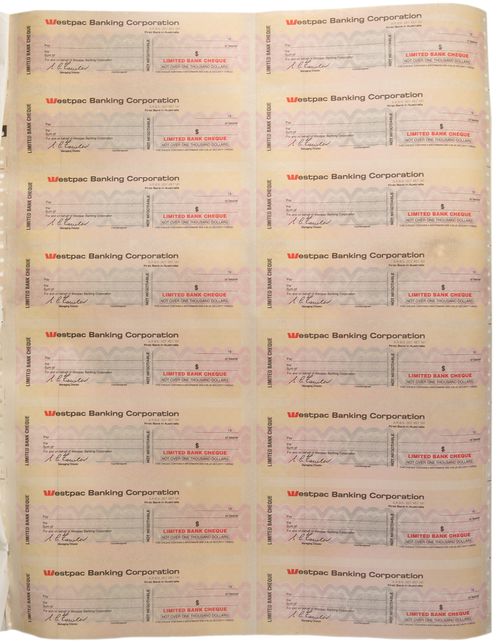 WESTPAC BANK CORPORATION, series of progressive proofs of the Bank's Cheque forms, printed with signature ...