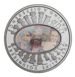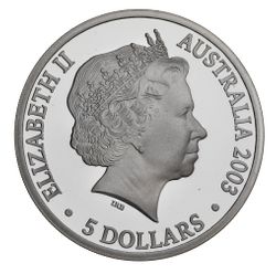 ELIZABETH II, proof silver five dollars, 2003, finale coin, Australia's Volunteers, hologram on reverse upside ...