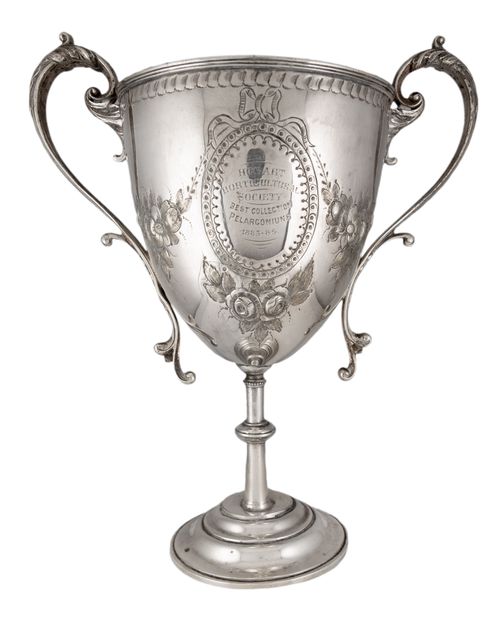 HOBART HORTICULTURAL SOCIETY, best collection of pelargoniums, 1885-86, silver plated cup (29x24cm) (770g), front engraved within decorative oval "HOBART / HORTICULTURAL / SOCIETY / BEST COLLECTION OF / PELARGONIUMS / 1885-86, rear engraved "AWARDED TO / S. BRIDGES / H.T. MANNING / Hon Sec". Small crack near base by stem, very fine.