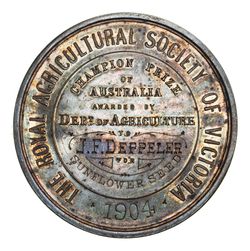 ROYAL AGRICULTURAL SOCIETY OF VICTORIA, Champion Prize, in silver (48mm), by Stokes & Sons, Melbourne, reverse inscribed, 'TO/J F DEPPELER/for/ SUNFLOWER SEED/1904'. Toned, extremely fine, with original case, broken.