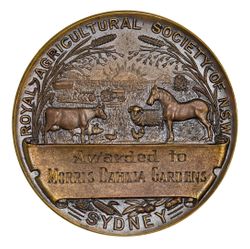 ROYAL AGRICULTURAL SOCIETY OF N.S.W.,ROYAL Easter Show, 1937, in bronze (54mm) by Stokes, Melbourne, inscribed on reverse, 'Awarded to/Morris Dahlia Gardens'; South Australian Chamber of Manufacturers Incorporated, All Australian Peace Exhibition, 1920, in bronze (51mm), inscribed on rev. 'Awarded to / Miss Pegg Clarke / Photography / Enlargements'; RHS Affiliated Societies, Ponoma Floral Medal, in bronze (48mm), South Australian Carnation, Daffodil, and Sweat Pea Society, reverse inscribed 'Awarded / to / C,E, Tamlin / For grand champion / Carnation of Show / 1957'. In original Stokes & Sons Pty Ltd fitted case, this with foxing and scuffing, medal toned uncirculated; nearly uncirculated; traces of mint red, uncirculated. (3)