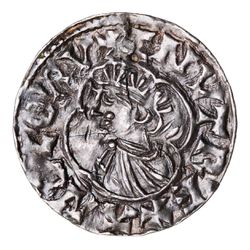 CNUT, (1016-1035 AD), silver penny (1.03g), quatrefoil type (c.1017-23), moneyer Adelphi, Leicester mint, obv. crowned bust left within well defined quatrefoil, single band to crown with three trefoils above, +CNVT REX ANGLORV around rev. long cross voided on quatrefoil with pellet at apex of each cusp, each limb terminating in three crescents, +ED ELPI ONLE HER (S.1157). Small 1mm flan crack in centre of crown, toned, good very fine.