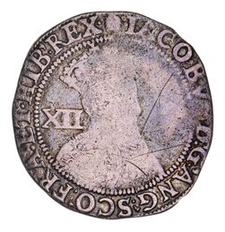 JAMES I, (1603-49), first coinage, silver shilling (5.30g), mm thistle, struck 1603-4, second bust (S.2646): ...