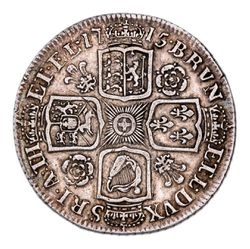 GEORGE I, silver shilling, first bust, 1715 rosa at planis (S.3645). A little rubbed otherwise very fine.