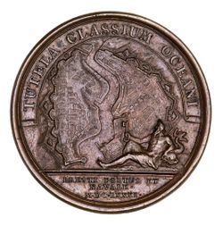 FRANCE, Louis XIV, in bronze (40mm) by Jean Mauger, medal commemorating Brest being made into a navel base, reverse plan of the fortified town and harbour, Neptune reclining right, key in left hand, right hand on dolphin, legend 'TUTELI CLASSIUM OCEANI', exergue, 'BRESTI PORTUS AT NAVALI M DC LXXXI'. Very fine.
