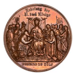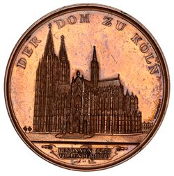 GERMANY, Kaiser Wilhelm I, 1880, in bronze (50mm) by Drentwett, celebrating the completion of Cologne Cathedral, obverse view of the front of the cathedral, reverse, nativity scene, exergue 'DOMBILD ZU KOLN'. Light brown patina, very fine.