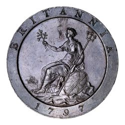 GREAT BRITAIN, George III, copper cartwheel penny, 1797(S.3777) 10 leaves in wreath. Good extremely fine. ...