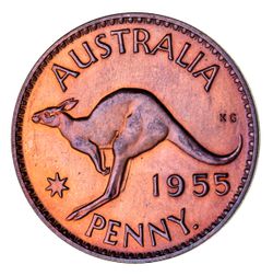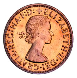 ELIZABETH II, Perth Mint, proof penny, 1955. Mostly red, some toning on the reverse, FDC ...