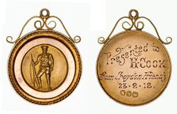 BRITISH WAR MEDAL 1914-18 TO WIA. 4770 Pte. H.Cook. 15 Bn. A.I.F. Impressed.; also Tribute Medal, in gold (9ct; 4.98g; 26mm), scroll and ring top suspender, reverse inscribed, "Presented to/H.Cook/from Croydon Friends/23.2.18.". First medal with hairlines, otherwise very fine, the tribute medal good very fine. (2)