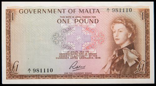 MALTA, Government of Malta, Elizabeth II, one pound (1954) (P.24b); Central Bank, one lira (P.34a). ...