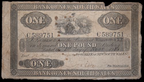 NEW ZEALAND, Bank of New South Wales, one pound, Wellington, 1/11/1919 C 589751 (P.S154m, date not listed). Rust in parts, top edge pieces missing otherwise very good and rare.