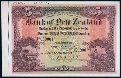 NEW ZEALAND, Bank of New Zealand, five pounds, Wellington 1st April 1917 discordant serials, 080001/120000 inked top left '073356 30.12.16', perforated cancelled, imprint on back Bradbury Wilkinson & Co London (P.S227). Wide left margin perforated, nearly uncirculated.
