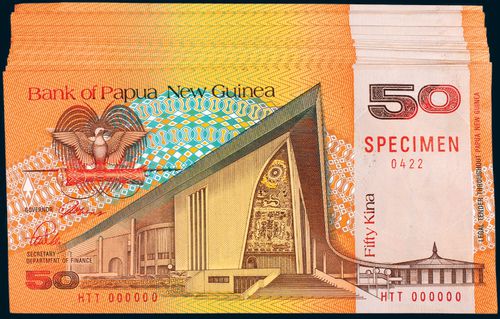 PAPUA NEW GUINEA, Bank of Papua New Guinea, specimen fifty kina, undated (1989) (P.11s), specimen numbers 0223-0249; 0251-0271; 0281-0300; 0413-0422 plus a single 0150. Notes slightly crinkled otherwise good extremely fine. (84)