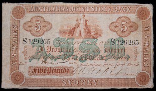 AUSTRALIAN JOINT STOCK BANK, five pounds, 1st July 1881 S 129265 (MVR 3). Nearly very ...