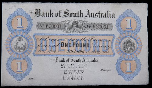 BANK OF SOUTH AUSTRALIA, specimen one pound, Adelaide, 1st July 1879, No V30001, "specimen/BW & ...