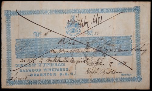 BUKKULLA VINEYARDS, Inverell, open value form issued for 1/14/6 by Messrs Wyndham, Branxton NSW, No 36 January 17 1871 (MVR type 3). Nearly very fine.
