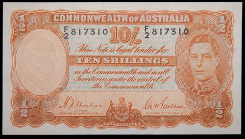 TEN SHILLINGS, Sheehan/McFarlane (1939) F/2 817310 (R.12). Virtually uncirculated.