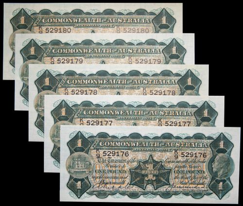 ONE POUND, Riddle/Heathershaw(1927) K/9 529176/80(R.26) five consecutive notes. Uncirculated and rare as such. (5)