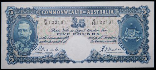 FIVE POUNDS, Riddle/Sheehan, (1938), R/16 122131 (R.446) white face. Pinholes top left, extremely fine.