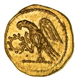 THRACE, Kingdom of, Koson, (c.42 B.C.), gold stater, (8.71 g), Northern Greece mint, obv. three togate figures advancing to left, the first and third carrying an axe over left shoulder, KO**SWN* in exergue, Brutus monogram to left, rev. eagle standing to left on sceptre, holding wreath in one claw, (S.1733, BMC 2, Winkler 1-3). Extremely fine and virtually as struck, rare.