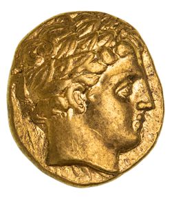 MACEDON, Kings of, time of Philip II - Alexander III, (340/36-328 B.C.), gold stater, (8.59 g), Amphipolis Mint, in the name and types of Philip II, obv. head of Apollo to right with laureate wreath, rev. galloping biga to right driven by charioteer holding kentron in right hand, reins in left hand, astragalos below, in exergue **FILIPPOU*, (cf.S.6663, Le Rider 28 [D12/R22], SNG ANS 245 (same dies). Some mint bloom, attractive portrait, good very fine or better and very scarce.