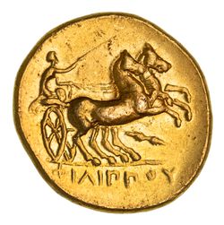 MACEDON, Kingdom of Philip II, (359-336 B.C.), gold stater, (8.43 g), Pella II Mint, issued c.340-328 B.C., obv. head of Apollo to right with laureate wreath, rev. galloping biga to right driven by charioteer holding kentron in right hand, reins in left hand, horizontal thunderbolt below horses, in exergue **FILIPPOU*, (cf.S.6663, Le Rider Group II cf.Pl.56, SNG ANS 130-137), Well centred, of fine style, good extremely fine and very scarce.