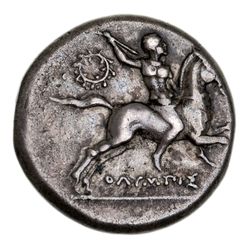 ITALY, Calabria, Tarentum, (c.240-228 B.C.), silver nomos [stater], (6.20 g), Olympis, magistrate, obv. Hippokontist on ...