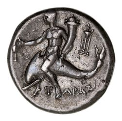 ITALY, Calabria, Tarentum, (c.240-228 B.C.), silver nomos [stater], (6.20 g), Olympis, magistrate, obv. Hippokontist on horseback right, hurling javelin, wreath to left, **OLUMRIS* below, rev. Phalanthos riding dolphin left, holding kantharos and cornucopia, tripod to right, T A**RAS* below, (S.378, Vlasto 942, HN Italy 1055, BMC 274-5). Good very fine with attractive light grey toning with irridescent hues.