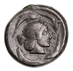 SICILY, Syracuse, (c.485-478 B.C. revised date 467-461), silver tetradrachm, (16.97 g), obv. fast walking quadriga driven to right by bearded male charioteer, Nike flying right crowning horses, rev. **SUPAKOSI O N* around to right, head of Artemis-Arethusa to right, hair slightly waved and turned up behind under diadem of beads, four dolphins around, (cf.S.914, Boehringer 276 same dies [obverse 127/reverse 189 dies]). Light grey tone, good very fine/very fine and very rare.