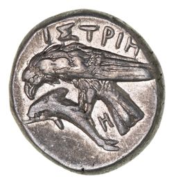 THRACE (MOESIA INFERIOR), Istros, (400-350 B.C.), silver drachm, (6.08 g), obv. two young male heads facing, side by side, right upright, left inverted, rev. I**S*TPIH above sea-eagle standing to left on dolphin to left, which it attacks with its beak, beneath eagle tail Greek Z (resembles an H), (cf.S.1669, Dima Group IV, Subgroup II, 1, AMNG I 429, HGC 3, 1801). Attractively toned, good very fine with traces of mint bloom, rare variety.