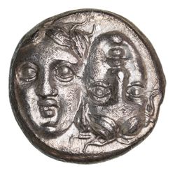 THRACE (MOESIA INFERIOR), Istros, (400-350 B.C.), silver stater, (4.94 g), obv. two young male heads facing, side by side, right inverted, left upright, rev. sea-eagle standing to left on dolphin to left, which it attacks with its beak, below dolphin monogram **AP*, (cf.S.1669, SNG BMC 249, BMC 6, SNG Stancomb 147, Pick 417). Lightly toned, good extremely fine with traces of mint bloom on reverse.