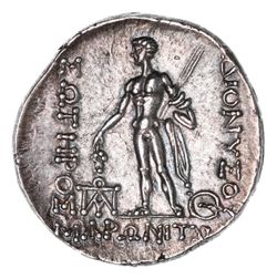 THRACE, Maroneia, (after 148 B.C.), silver tetradrachm, (16.06 g), obv. head of young Dionysos to right, wreathed with ivy and band across forehead, rev. Dionysos naked standing to left, holding grapes and two narthex wands, to right **DIONUSIOU*, to left **SWTHROS, below **MARWNITWN, PAUW* monogram to left, **Q* to right with cental pellet, (cf.S.1635, Schonert-Geiss 1116 [obv.35], BMC 59, ACNAC Dewing 1295 [same obverse die], HGC 3, 1556). Good metal, delightful grey patination, minor mark on cheek, extremely fine and rare.