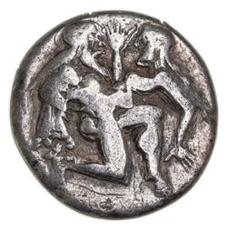THRACE, Island off, Thasos, (c.early 5th century B.C.), silver stater, (8.09 g), obv. naked ithyphallic satyr (classical style) in kneeling running attitude carrying off nymph raising hand in protest, rev. quadripartite incuse square, (S.1746, Asyut Hoard -, BMC 24-25, McClean 4197, SNG Cop. 1010, ACNAC Dewing 1312, HGC 6, 331). Toned, very fine and very scarce.