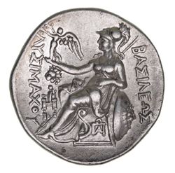 THRACE, Kingdom of, Lysimachos, (305-281 B.C.), silver tetradrachm, (16.90 g), Ainos Mint, issued c.283/2 B.C., obv. head of Alexander to right, with diadem and horn of Ammon, within dotted border, rev. Athena enthroned to left, supporting Nike, shield at side, lion head above cult image on throne in inner left field, **BASILEWS* to right **LUSIMACOU* to left, monogram on throne, (cf.S.6814,^Thompson 257, Muller 119, CNG 100, lot 1312 [same dies]). Lightly toned, good very fine and very rare.