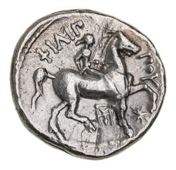 MACEDON, Kingdom of Philip II, (359-336 B.C.), silver tetradrachm, (14.45 g), Amphipolis III Mint, issued c. 323/2-316/5 B.C., obv. head of Zeus laureate to right, rev. naked youth or small man (Philip II or jockey), on horseback to right, holding a branch, monogram and star below, above **FILIP POU*, (cf.S.6683, Le Rider Pl.46, 10, [same obverse die as p.124, type not noted in Le Rider], Troxell (Alexander type) Group I2 [p.52, notes type issued], cf. Muller 289). Bright, good very fine and very rare.