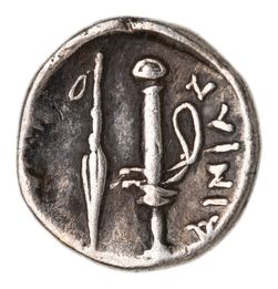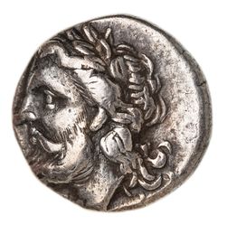 THESSALY, Ainianes, (c.350s-340s B.C.), silver obol, (10mm, 0.86 g, 12h), Hypata Mint, obv. laureate head of Zeus left, rev. spear point and sword in scabbard, AINAN below. (S.-, Liampi, Beitrag Group II, BCD Thessaly II 28, HGC 4, 40). Lightly toned, very fine, struck from good metal.