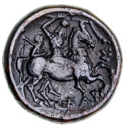 THESSALY, Pharsalos, (3rd century B.C.), bronze trichalkon, (8.22 g), obv. three quarter facing head of Athena in Corinthian helmet, rev. helmeted cavalryman charging right on horseback, with a bird perched on helmet, footman brandishing flail behind, **S FAR* (HGC 4 646, Rogers 503-4, BCD Thessaly II 671.3-4). Even dark patina with chocolate highlights, very fine.